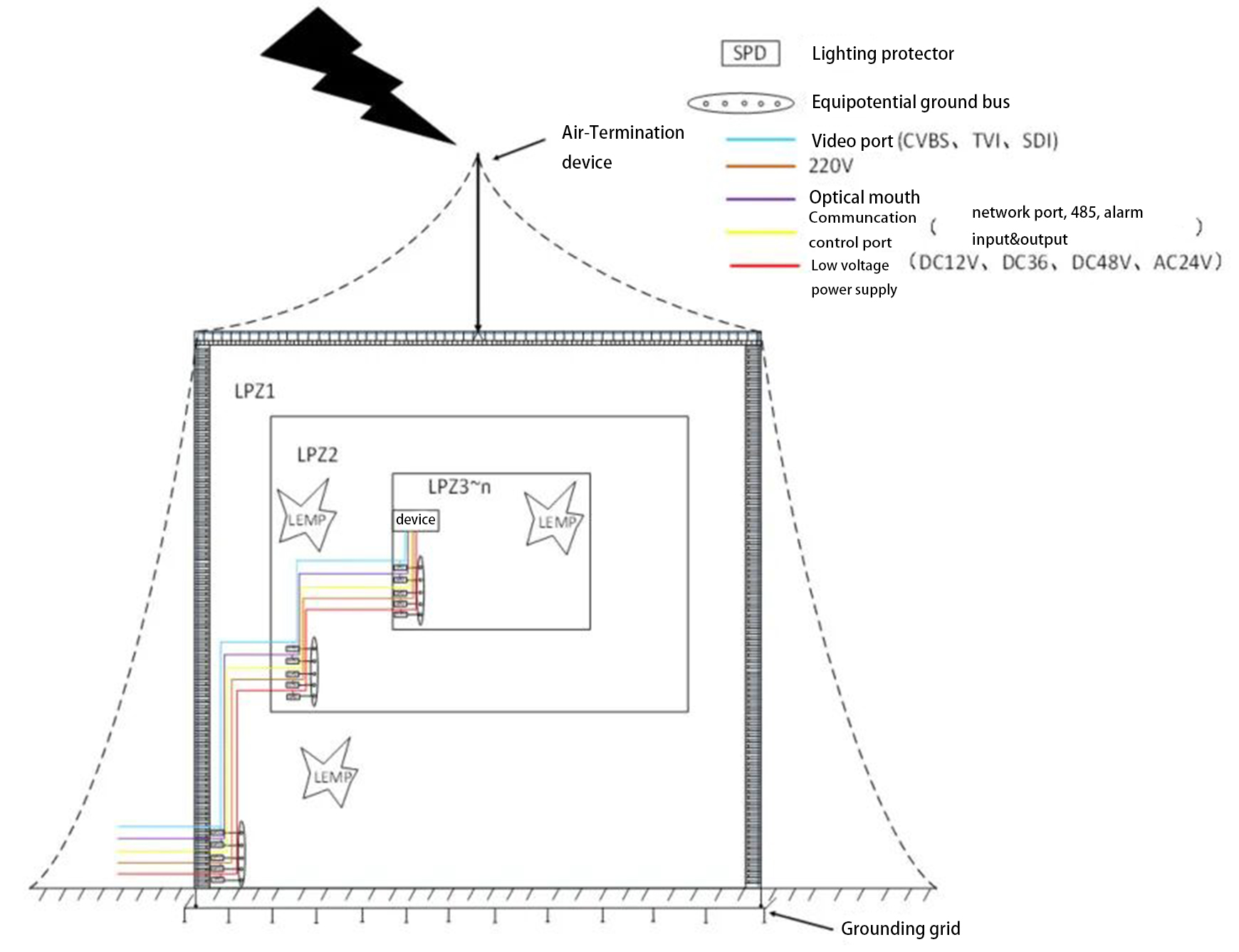 Protecting against lightning EMP can be costly, and since the occurrence probability is low, it is generally not specifically addressed, relying on the building’s lightning protection instead. To prevent ground potential rise, the use of building lightning protection systems such as lightning rods for grounding should be avoided.