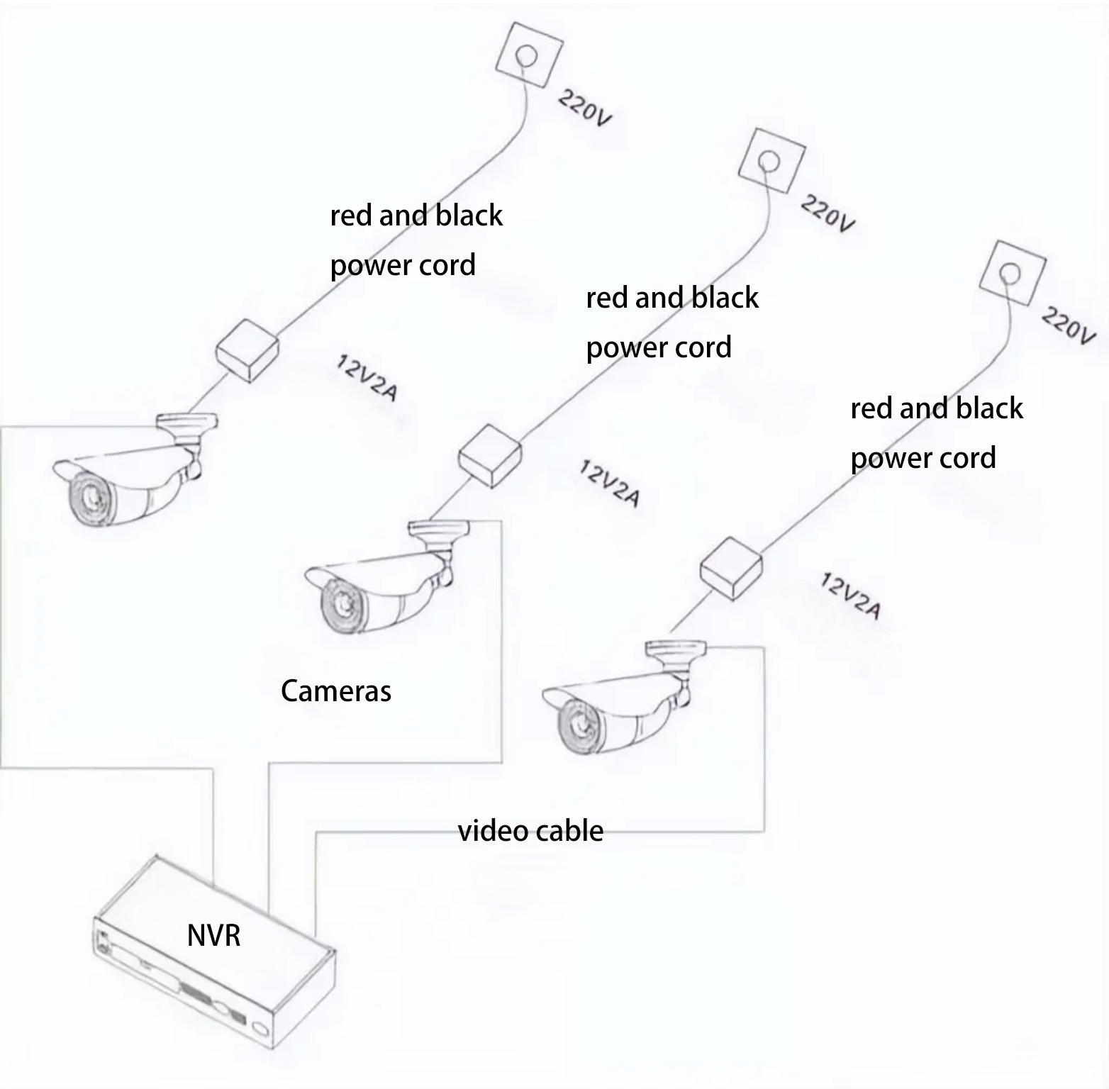 - 2×1.0 red/black power cables are used to connect cameras