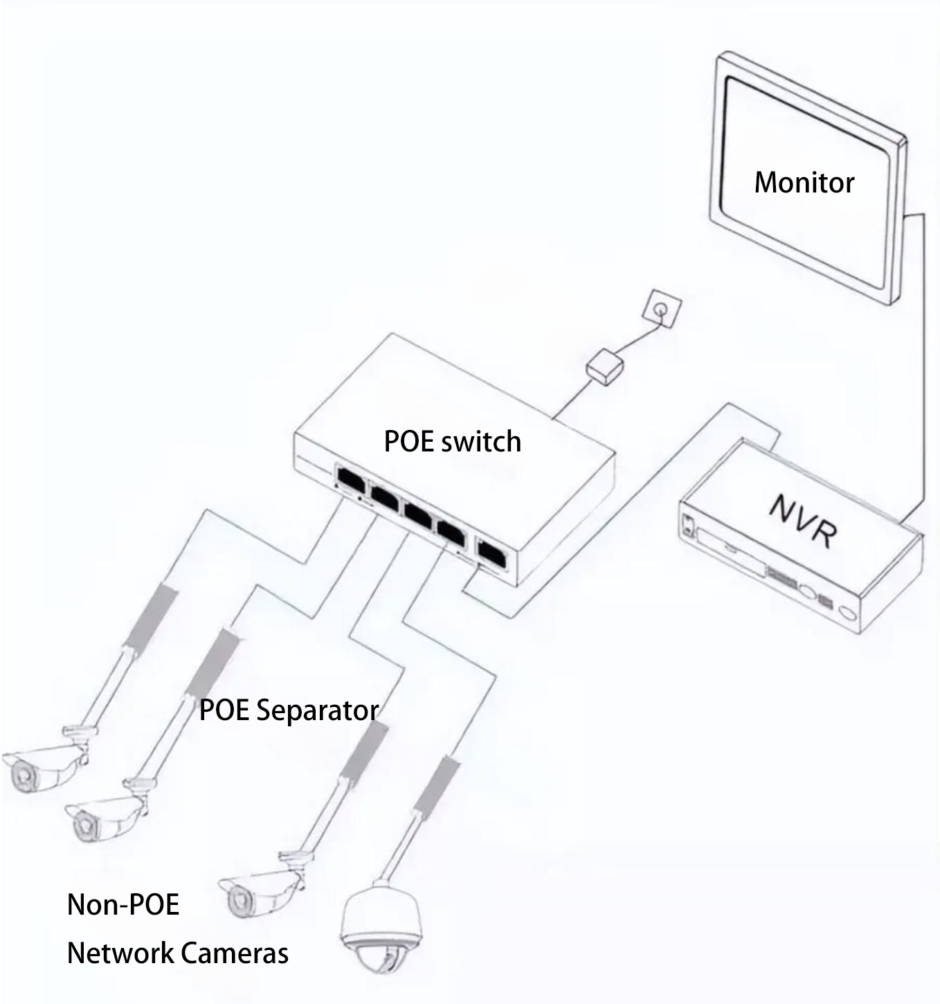 - A PoE switch connects to a PoE splitter