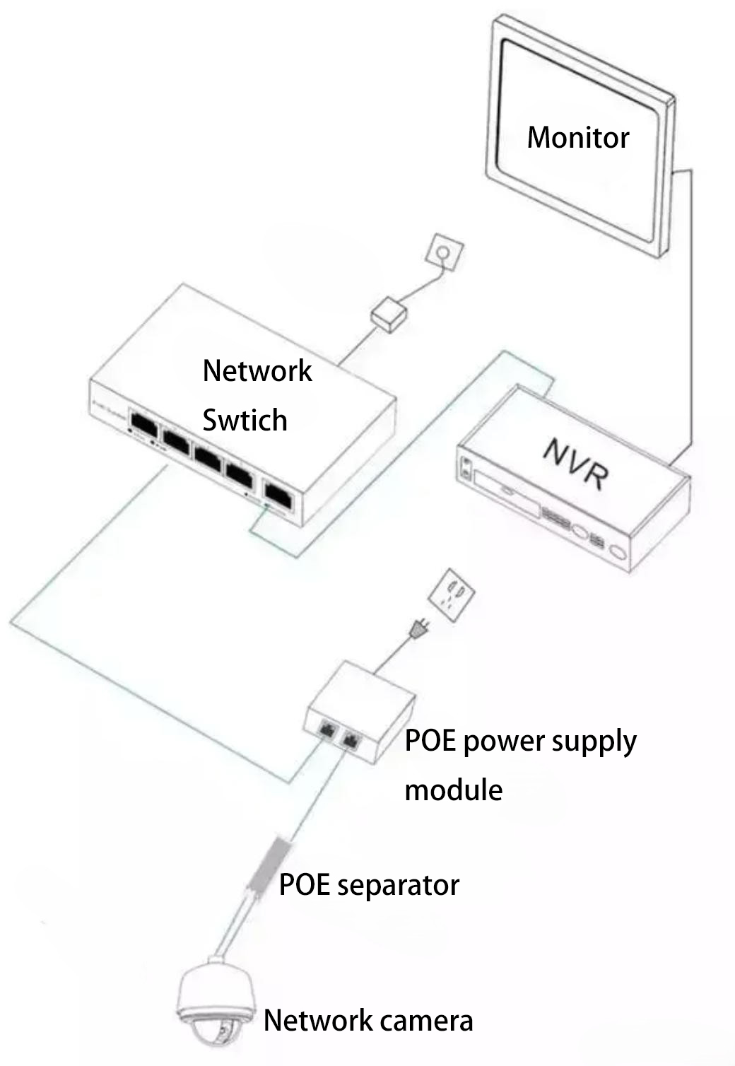 - Switch → PoE injector → PoE splitter → terminal device