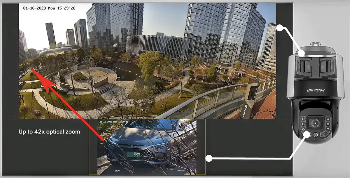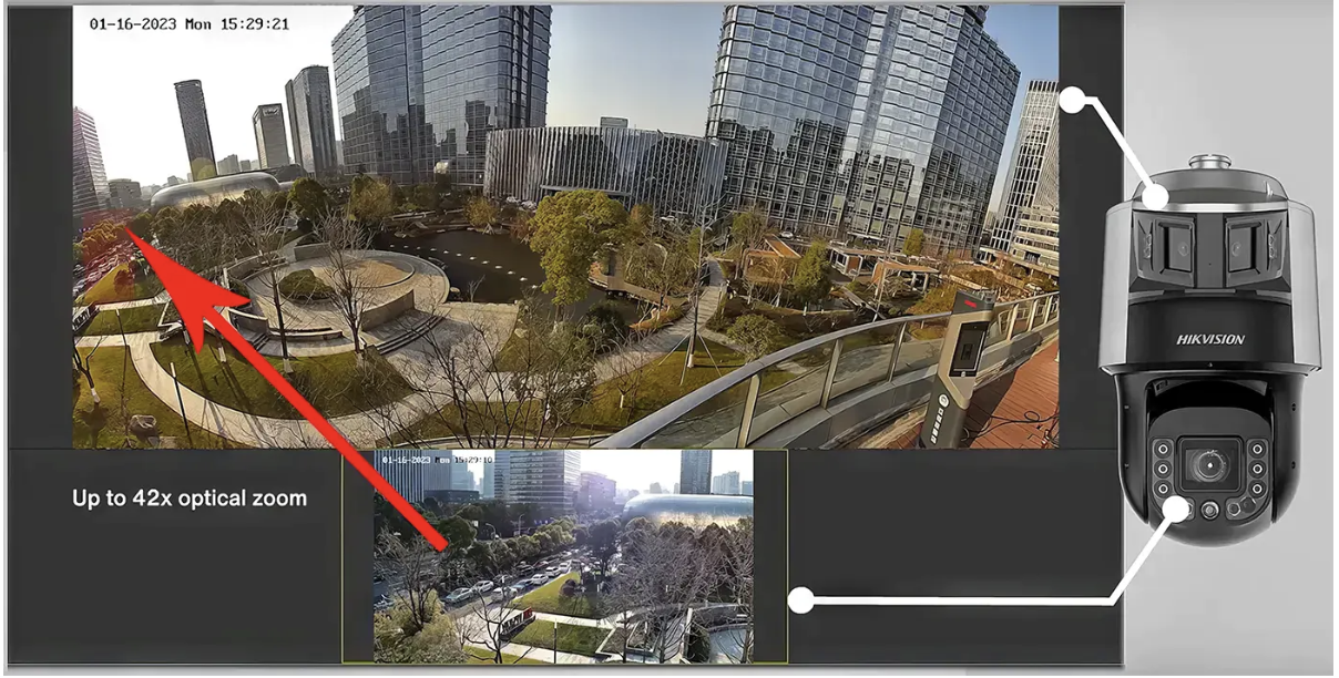 We will test the performance and distance of the Hikvision TandemVu PTZ Camera. This particular camera is a specialized surveillance solution that combines two cameras in one housing. It integrates a PTZ (pan-tilt-zoom) camera and a panoramic camera to provide comprehensive monitoring capabilities in a single device. The PTZ functionality allows users to focus on specific areas or objects with precise control and detailed observation. Meanwhile, the panoramic camera offers a wide-angle view, covering large areas without constant movement or adjustment.
