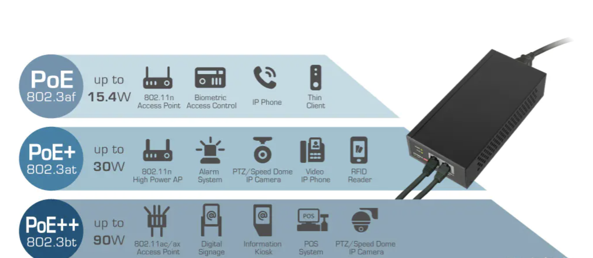• PoE Middleware: This refers to software or hardware components used to manage and monitor PoE networks, including power management and consumption monitoring.